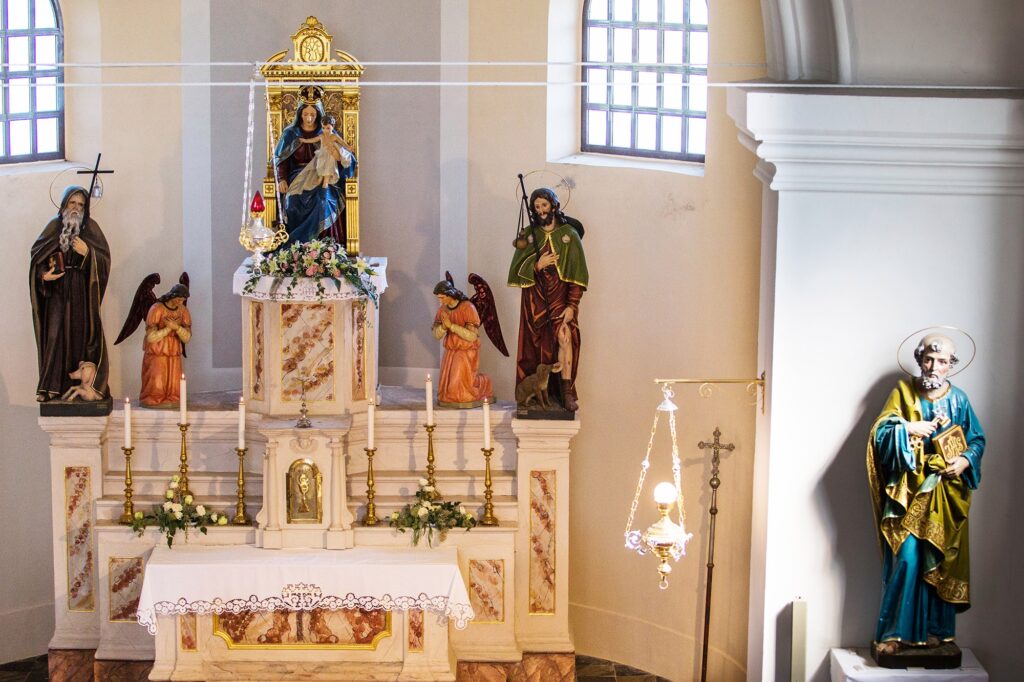 Glavni oltar je delno zidan iz kamna, delno lesen. Krasi ga lesen kip Karmelske Matere Božje (kateri je oltar tudi posvečen) na tronu z Jezuščkom v naročju ter »škapularjem« v roki. Kip je izdelal Ferdinand Perathonen iz Valgardene leta 1904. Najbrž sta istega datuma in stila tudi kipa sv. Roka (desno) in sv. Antona (levo). Dva angela Kerubina ob Marijinem kipu sta iz leta 1918. Iztesal ju je Adolf Vogel iz kraja HaI pri Innsbrucku. Vsi kipi z glavnega oltarja so iz lesa in v naravni velikosti.4